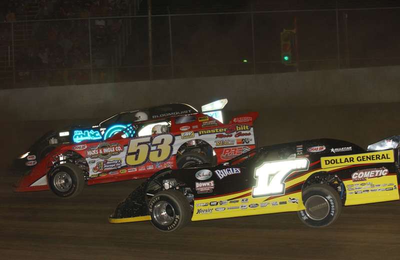 Ray battles three-wide at the Muskingum County (OH) Speedway on July 3, 2009 -